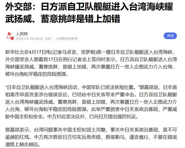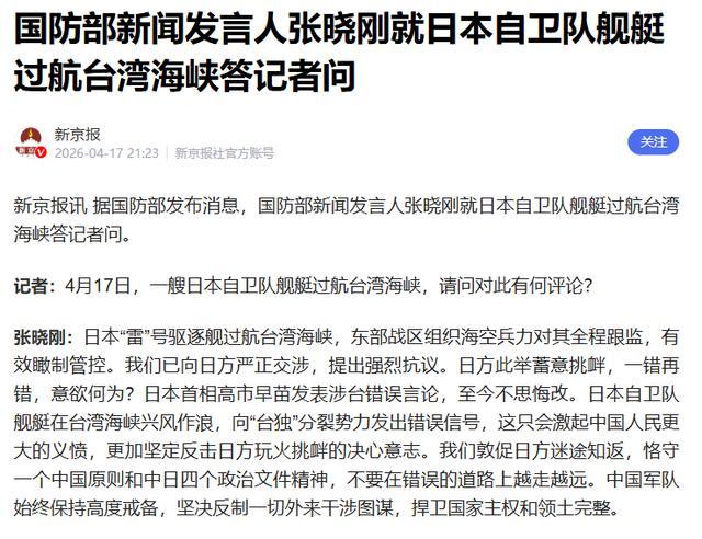 国防部发言人张晓刚的话,说得更重:"日方此举蓄意挑衅,一错再错,意欲何为?" 张晓刚直接点名高市早苗——涉台错误言论至今不思悔改,日本自卫队舰艇在台湾海峡兴风作浪,只会激起中国人民更大的义愤。