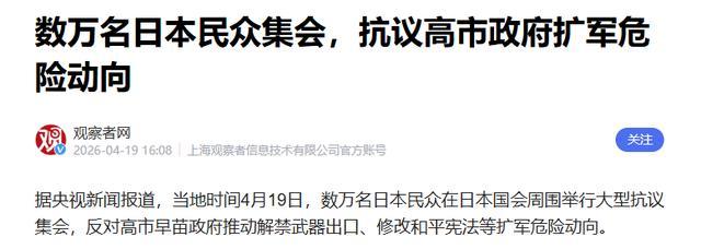 这已经不是第一波。4月8日晚,东京国会议事堂前就有大批民众集会,抗议高市政府部署远程导弹、企图解禁杀伤性武器出口。据《东京新闻》报道,日本全国130多个地点当天同步举行类似街头抗议。