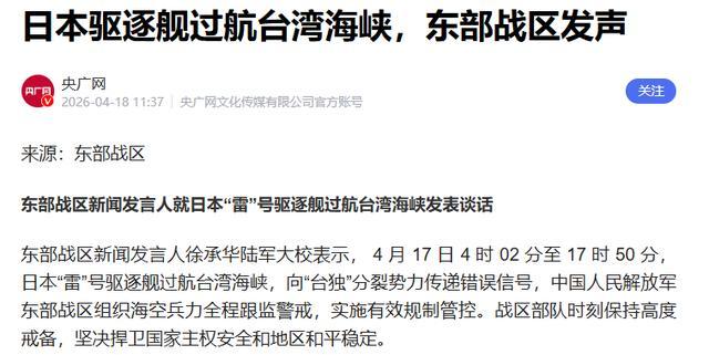 4月17日凌晨4点02分到下午5点50分,整整13个多小时,日本海上自卫队一艘"雷"号驱逐舰,单独穿航台湾海峡。